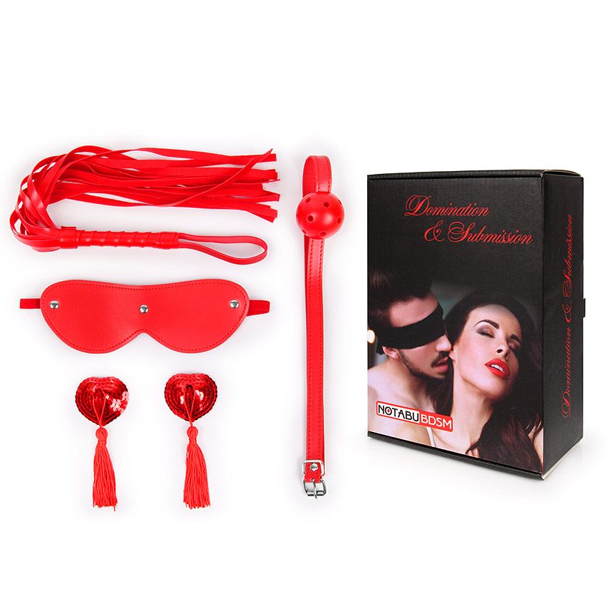 Великолепный набор аксессуаров для любителей БДСМ-игр. В комплект входят плеть, кляп, маска и пэстисы для украшения сосков. Плеть-флогер состоит из длинных хвостов и удобной рукоятки с петлёй для наматывания на руку или подвешивания на крючок. Кляп оснащён шариком с отверстиями для дыхания. В комплекте: плеть, кляп, маска и пэстисы.