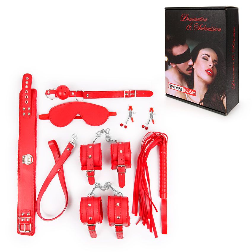 Великолепный набор аксессуаров для любителей БДСМ. В комплект входят кляп, наручники, оковы, ошейник, поводок, верёвка, маска, плеть, зажимы для сосков. Кляп состоит из пластмассового шарика с отверстиями для дыхания и ремней с возможностью регулировки размера. Наручники и оковы снабжены металлической цепочкой, которая позволяет скреплять изделия вместе. Внешняя сторона наручников, оков, ошейника и маски выполнена под кожу, внутренняя отделана мехом, который предотвращает натирание кожи. Зажимы для сосков имеют эластичные накладки, которые препятствуют сильному сдавливанию сосков. На каждом изделии предусмотрен регулировочный винт, позволяющий контролировать силу сдавливания сосков. Небольшие подвески украшают зажимы. Плеть-флогер состоит из хвостов и отделанной искусственной кожей рукоятки с петлей. В комплекте: маска, кляп, зажимы, плётка, ошейник, наручники, оковы.