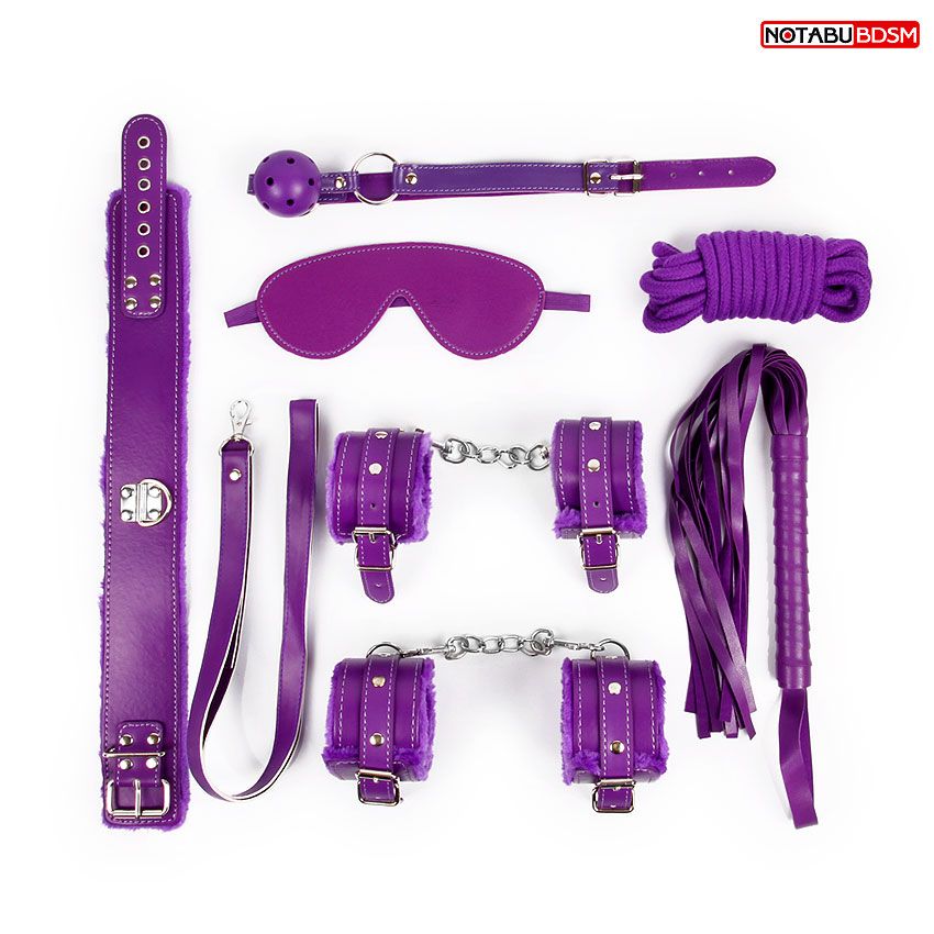 Великолепный набор аксессуаров для любителей БДСМ. В комплект входят кляп, наручники, оковы, ошейник, поводок, верёвка, маска, плеть. Кляп состоит из пластмассового шарика с отверстиями для дыхания и ремней с возможностью регулировки размера. Наручники и оковы снабжены металлической цепочкой, которая позволяет скреплять изделия вместе. Внешняя сторона наручников, оков, ошейника и маски выполнена под кожу, внутренняя отделана мехом, который предотвращает натирание кожи. Плеть-флогер состоит из хвостов и отделанной искусственной кожей рукоятки с петлей. В комплекте: маска, кляп, плётка, ошейник, наручники, оковы, верёвка.