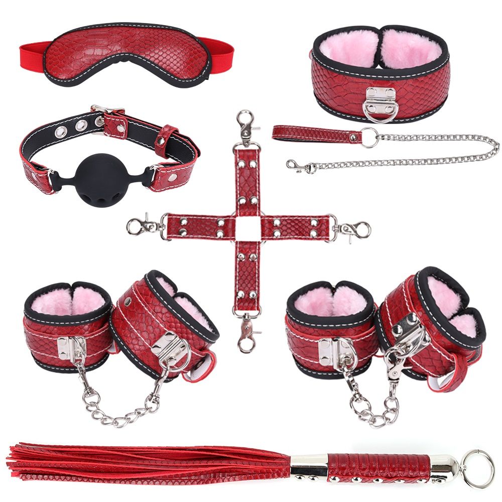 Великолепный набор аксессуаров для любителей БДСМ. В комплект входят наручники, оковы, ошейник с цепочкой-поводком, фиксатор, плетка, кляп, маска. Кляп, наручники, оковы, ошейник и маска снабжены мягкой внутренней подкладкой, предотвращающей натирание кожи. Также изделия имеют возможность регулирования размера. Плеть-флогер состоит из хвостов и удобной рукоятки с металлическими вставками и кольцом для подвешивания на крючок. Кляп оснащен шариком с отверстиями для дыхания. БДСМ аксессуары отделаны под кожу рептилии. В комплекте: наручники, оковы, ошейник с цепочкой-поводком, фиксатор, плетка, кляп, маска.