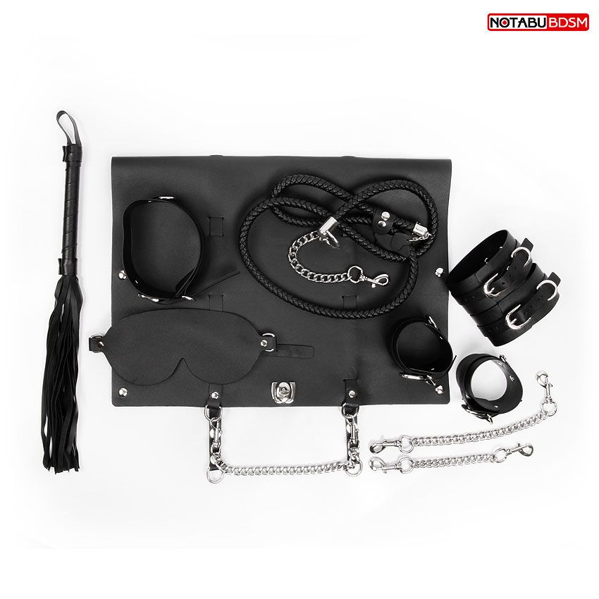 Великолепный набор аксессуаров для любителей БДСМ-игр. В комплект входят маска, фиксатор, ошейник с плетённым поводком, наручники, оковы, плеть. Наручники, оковы, ошейник и маску можно регулировать по размеру. При необходимости наручники и оковы скрепляются с помощью цепочек. В набор входит специальная сумка с ручкой-цепочкой для хранения интимных аксессуаров. В комплекте: маска, фиксатор, ошейник с плетённым поводком, наручники, оковы, плеть. Длина ручки плети - 15 см., хвостов - 23 см.