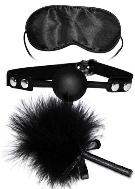 Набор для БДСМ-игр: сатиновая маска на глаза, кляп-шар из силикона на ремешках, пёрышко. В комплекте: маска, кляп, пёрышко. Диаметр шара - 4 см.
