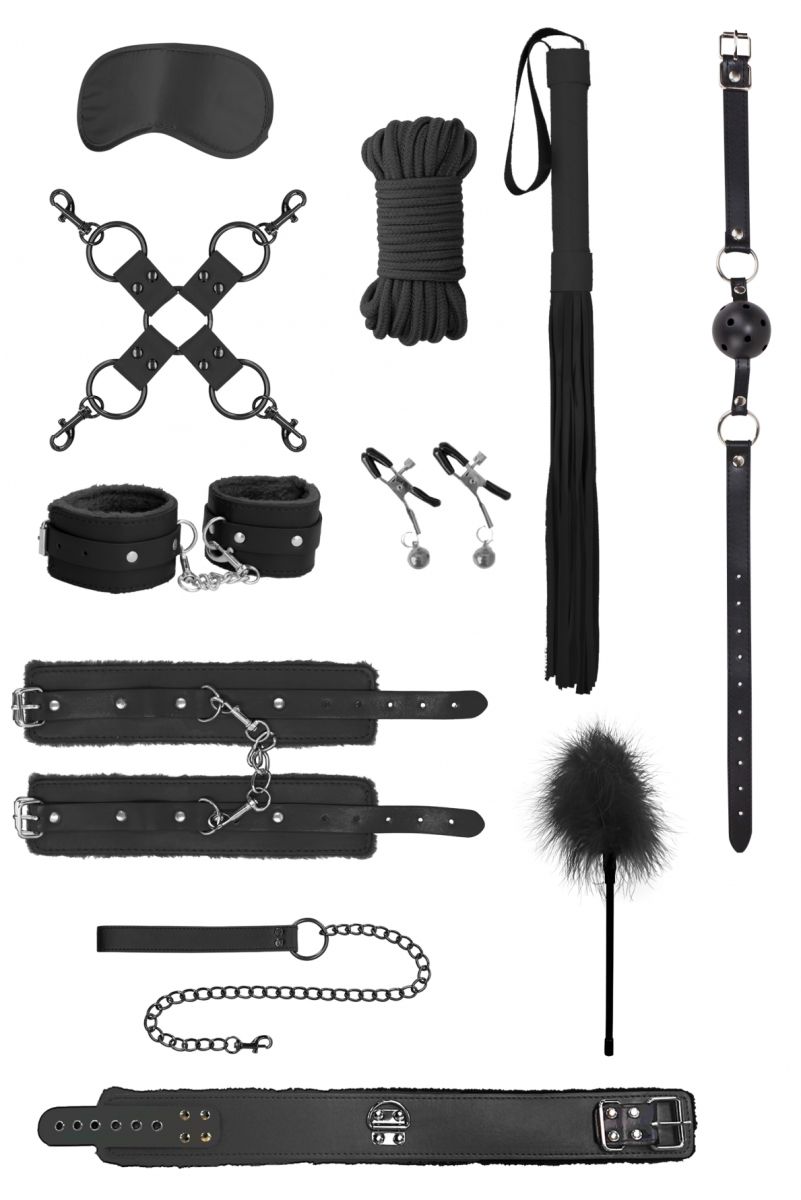 Intermediate Bondage Kit – набор, состоящий из 10 предметов для эротических ролевых игр и практик БДСМ. В комплекте: кляп-шарик, наручники, поножи, маска, пуховка, плеть, крестообразный фиксатор, веревка, зажимы для сосков, ошейник с поводком. Длина веревки - 10 м. Длина пуховки – 28 см.