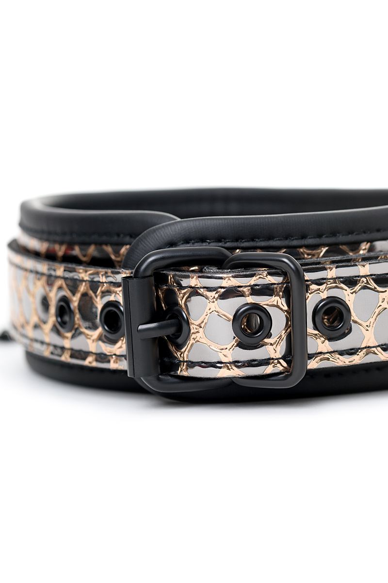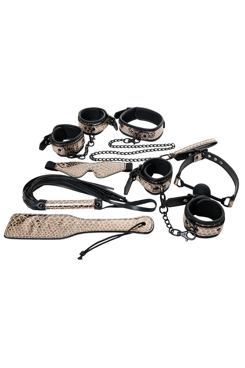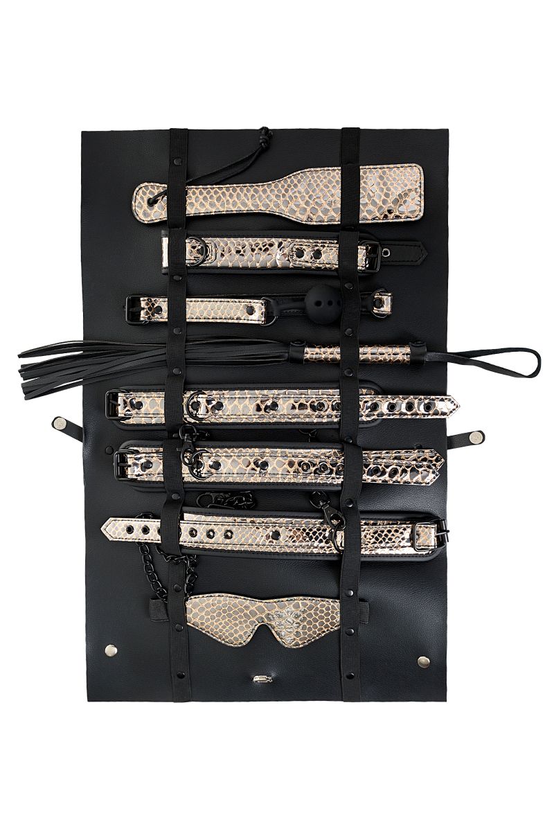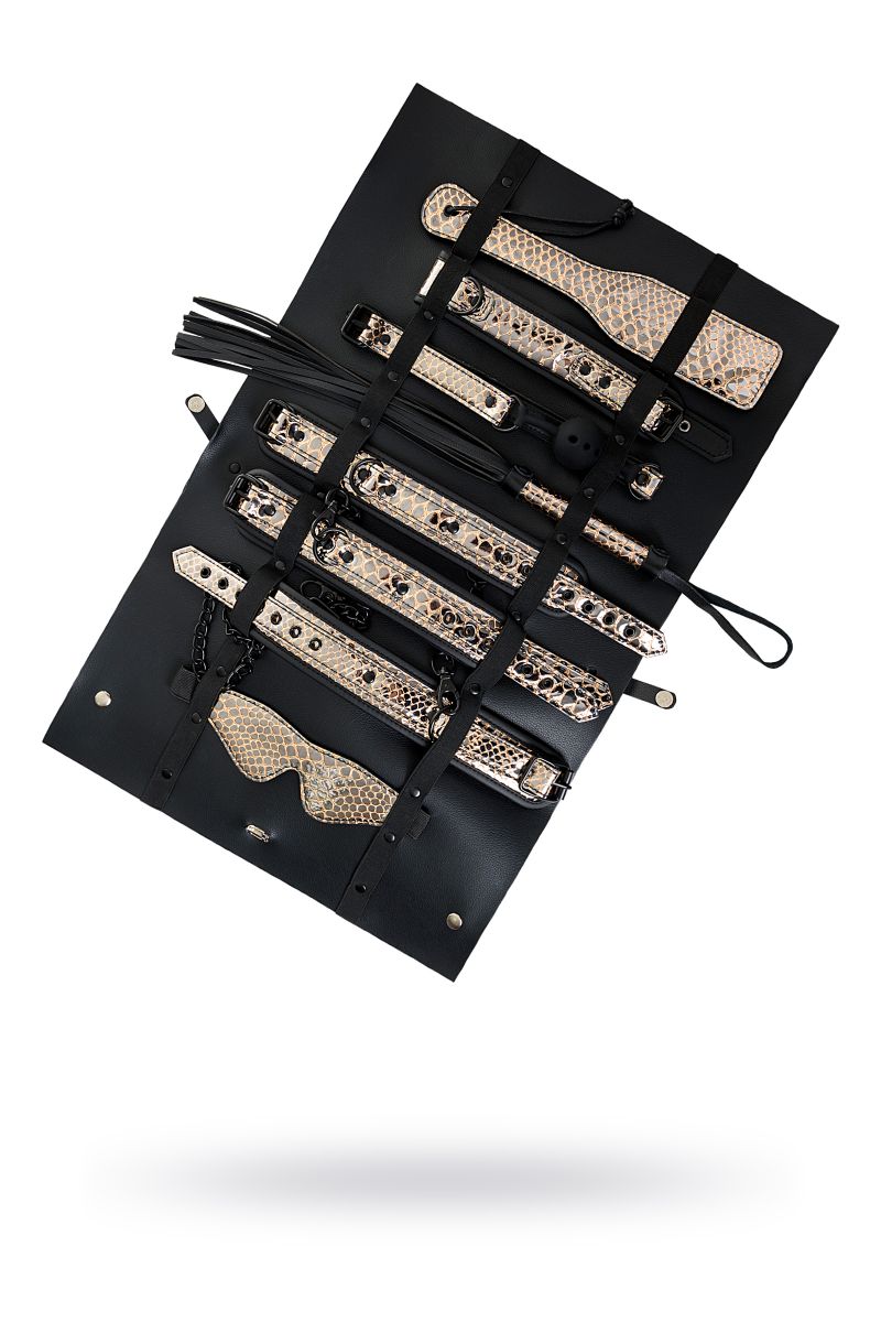 Роскошный БДСМ-набор Waname Fetish Goddess — стильная коллекция аксессуаров для ролевых игр, в которой собрано все самое необходимое для перевоплощения в строгую госпожу или прекрасную рабыню. Набор состоит из 8 предметов из экокожи, стилизованной под кожу рептилий. Каждый из аксессуаров призван подчеркнуть ваш безукоризненный вкус: изящная плетка, красивые наручники и оковы для ног, элегантный ошейник и маска, прелестная шлепалка и кляп, а также удобная сумочка для хранения коллекции. Вы будете чувствовать себя раскрепощенной в любой роли. Вы увидите в своем партнере желание подчиниться вам беспрекословно или жажду владеть вами без остатка. Вам выбирать, какой оттенок страсти будет у этой ночи. Goddess от Waname Fetish — еще никогда ролевые игры не были столь привлекательными. В комплекте: маска, кляп, ошейник, поводок, пэддл, флоггер, наручники, оковы на ноги. Длина маски - 19,5 см. Диаметр кляпа-шара - 4,2 см. Длина манжет наручников - 26,5 см. Длина манжет оков - 31 см. Длина ошейника - 44 см. Длина поводка - 83,5 см. Длина пэддла - 32 см. Длина флоггера - 46,5 см.