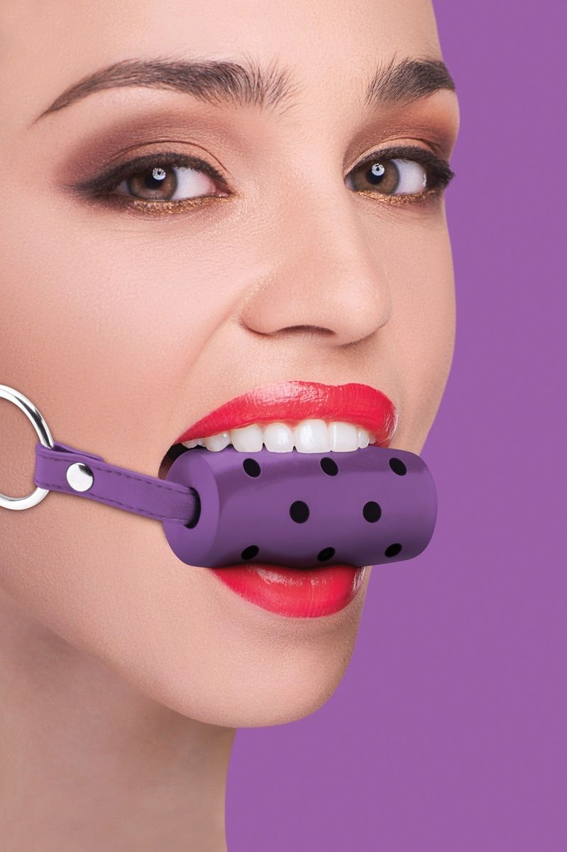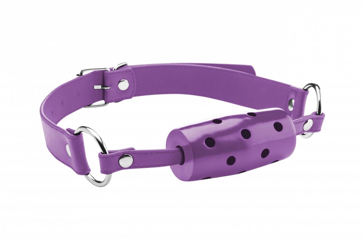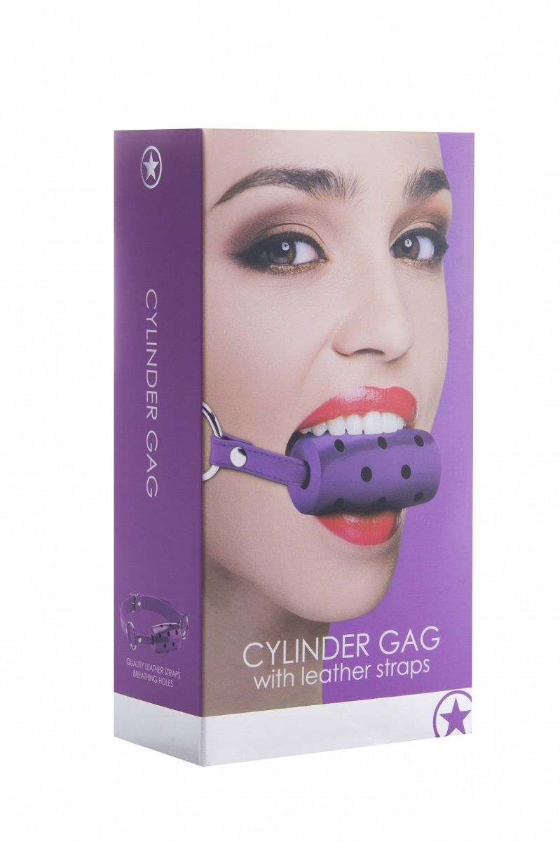 Фиолетовый резиновый кляп-цилиндр на кожаных ремешках Shots Media BV Cylinder OU122PUR