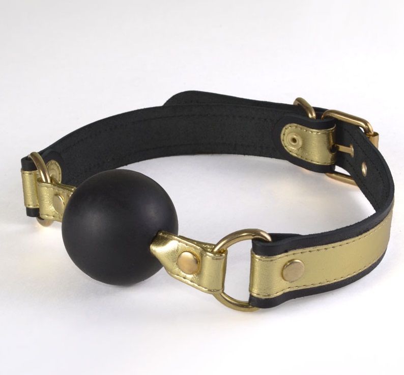 Кляп состоит из шара сферы средних размеров и ремешков, при помощи которых можно зафиксировать изделие или отрегулировать размер. Упругий кляп-шар изготовлен из современного материала ТЭП, который соответствует нормам безопасности. Ремешки изделия выполнены из высококачественной натуральной кожи черного цвета и украшены вставками под золото. Вся металлическая фурнитура имеет никелевое покрытие. Ширина ремешков - 2,5 см. Диаметр шара - 4,5 см.