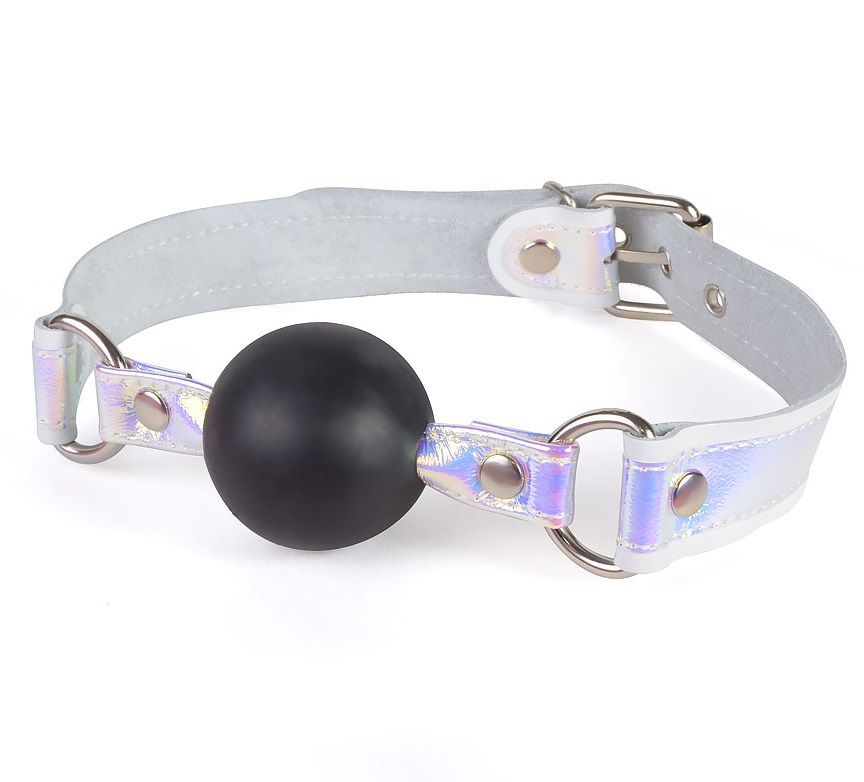 Кляп-шарик – приспособление для лишения партнёра возможности издавать громкие звуки и произносить членораздельные слова. Гаг состоит из цельного черного шара из современного материала ТЭП и ремня для фиксации из плотной натуральной кожи белого цвета с перламутровой вставкой и металлическими заклёпками с никелевым покрытием. Особенностью материала является то, что помимо белого и голубого он способен принимать розовые, желтые и другие оттенки. Ширина ремешков - 2,5 см. Диаметр шара - 4,5 см.