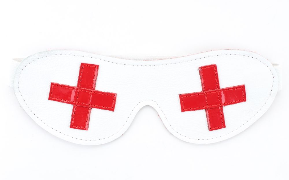 Маска из натуральной кожи на резиночке. Декорирована ярко-красными крестиками. Имеет красный подклад из мягкой перфорированной кожи. Ширина - 7 см.