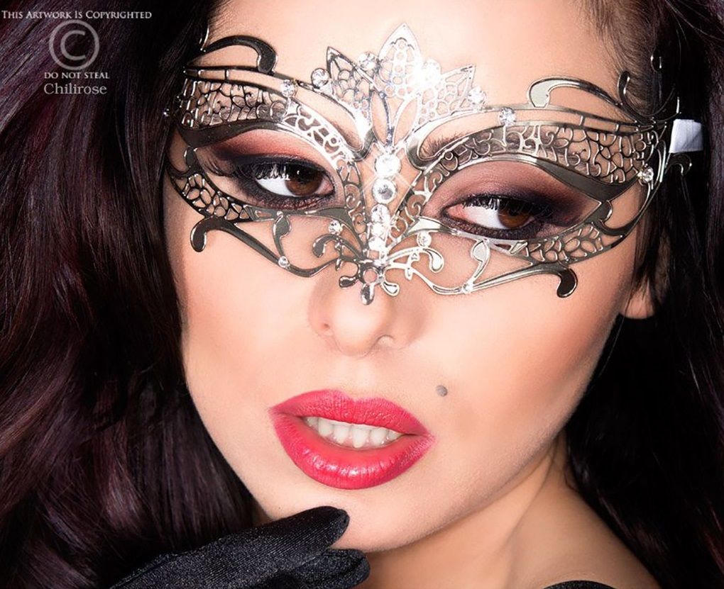 Необходимый аксессуар для каждой соблазнительницы! Маска изготовлена из латуни, украшена сверкающими кристаллами. Атласные ленты с каждой стороны надежно удерживают маску.
