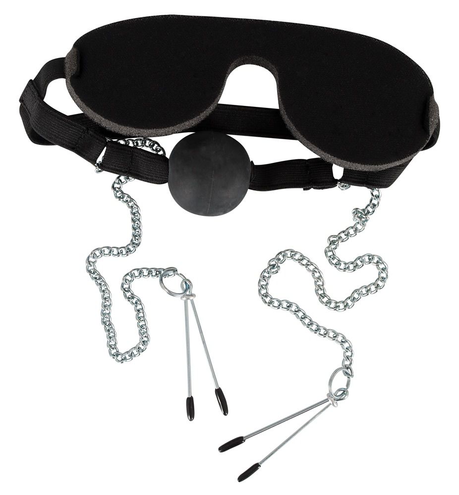 Маска с кляпом и зажимами для сосков Bad Kitty. Длина зажимов - 7 см.