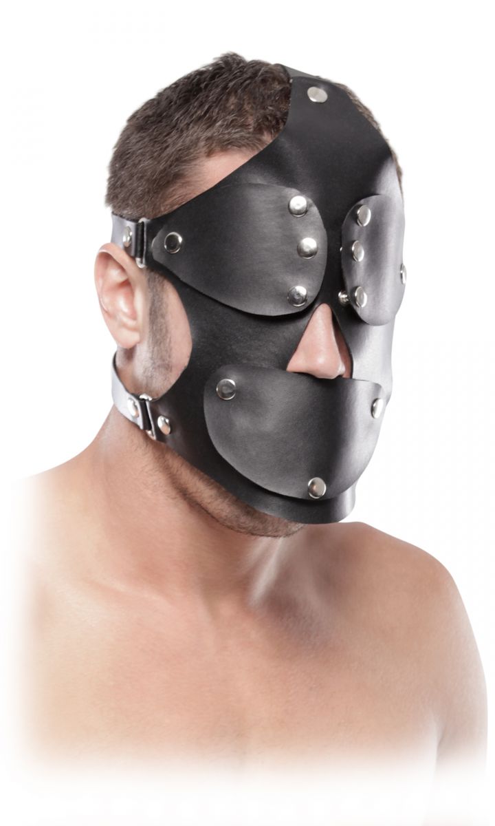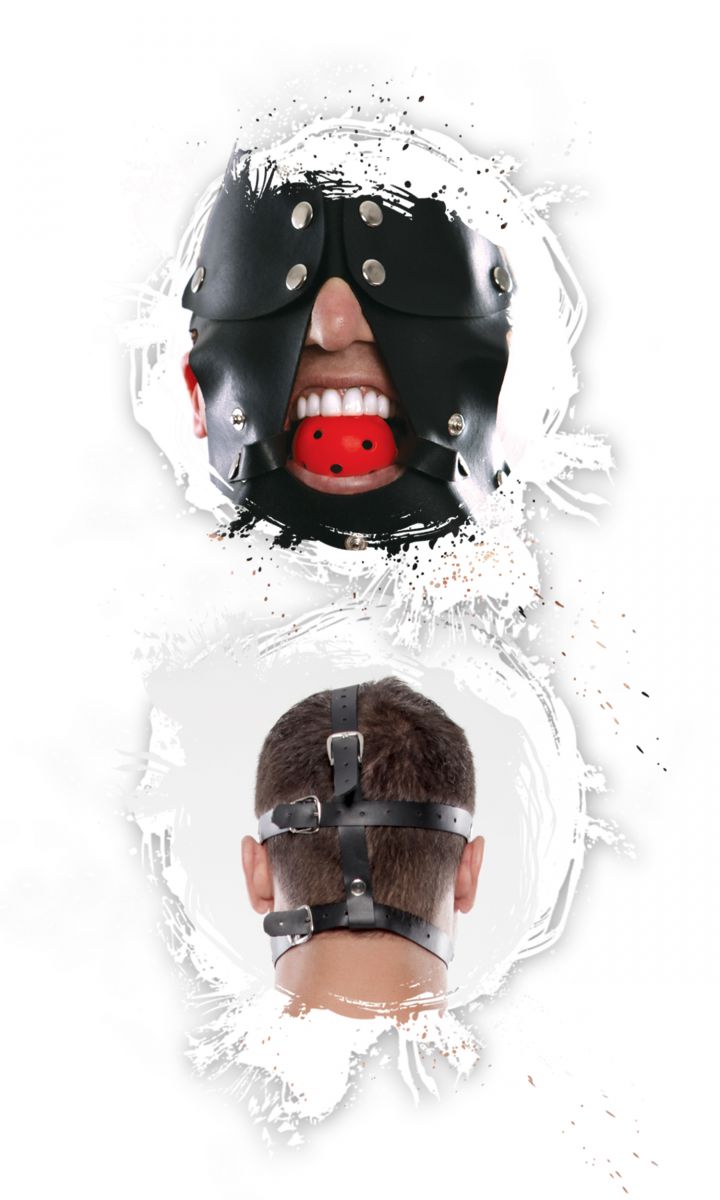 Это полный комплект из черной кожаной маски и красного дышащего кляпа, спрятанного под ним. Кляп изготовлен из твердого пластика. Маска унисекс, соединяется с регулируемой пряжкой на спине. Маска также имеет съемные части на глазах.