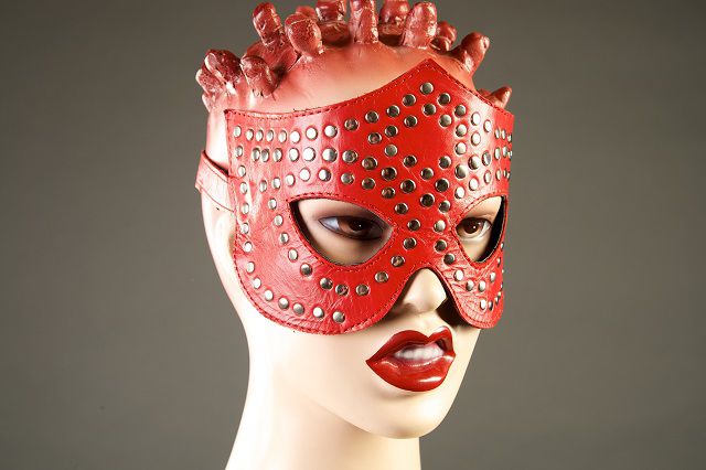Маска ручной работы изготовлена из натуральной кожи и украшена металлическими заклепками. Маска плотно застегиваются с помощью ремешка с регулируемой пряжкой. Данное изделие станет прекрасным дополнением вашего образа в стиле БДСМ. Ширина - 13,5 см.