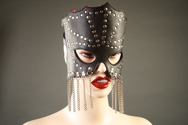 Маска ручной работы изготовлена из натуральной кожи, украшена цепочками и металлическими заклепками. Маска плотно застегиваются с помощью ремешка с регулируемой пряжкой. Данное изделие станет прекрасным дополнением вашего образа в стиле БДСМ. Ширина - 19 см.