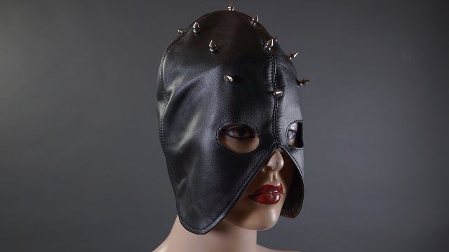 Необычный полушлем с прорезями для глаз выполнен из натуральной мягкой кожи, декорирован шипами и шнуровкой, позволяющей регулировать размер. Данная модель станет прекрасным дополнением вашего образа в стиле БДСМ. Все ее детали тщательно продуманы и выполнены вручную.