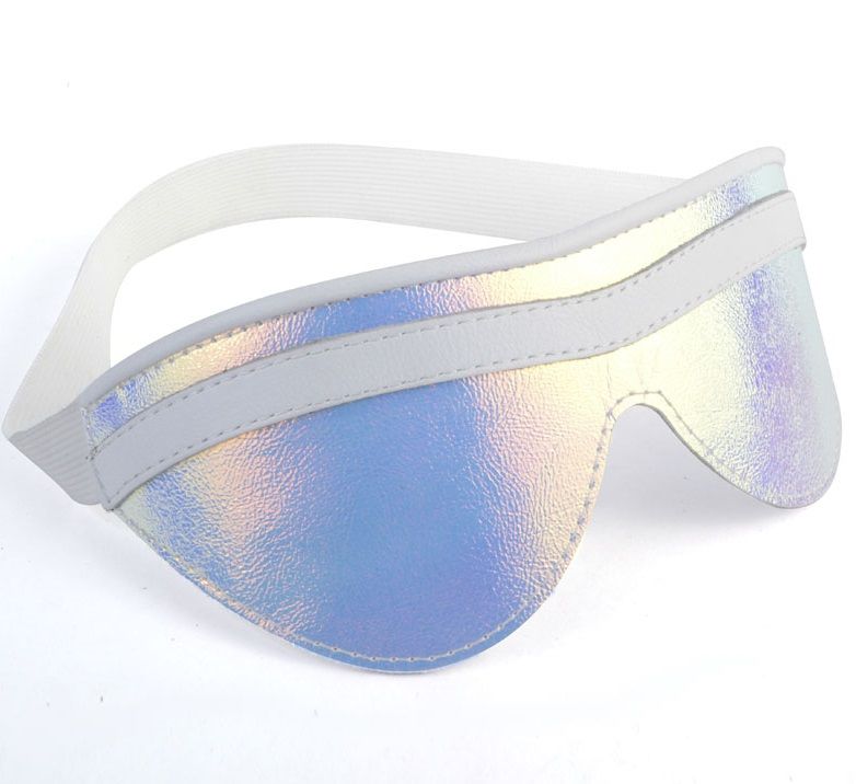 Маска на глаза закрытого типа из натуральной кожи и голографического материала перламутрового цвета с белой отделкой. Особенностью материала является, то, помимо белого и голубого, он способен принимать розовые, желтые и другие оттенки. Фиксирующая резинка позволяет легко регулировать размер изделия. Внутренняя часть имеет подкладку из велюровой бархатистой кожи. Ширина - 7 см.