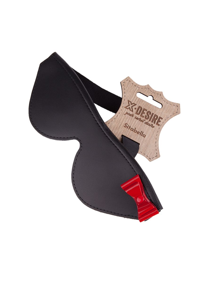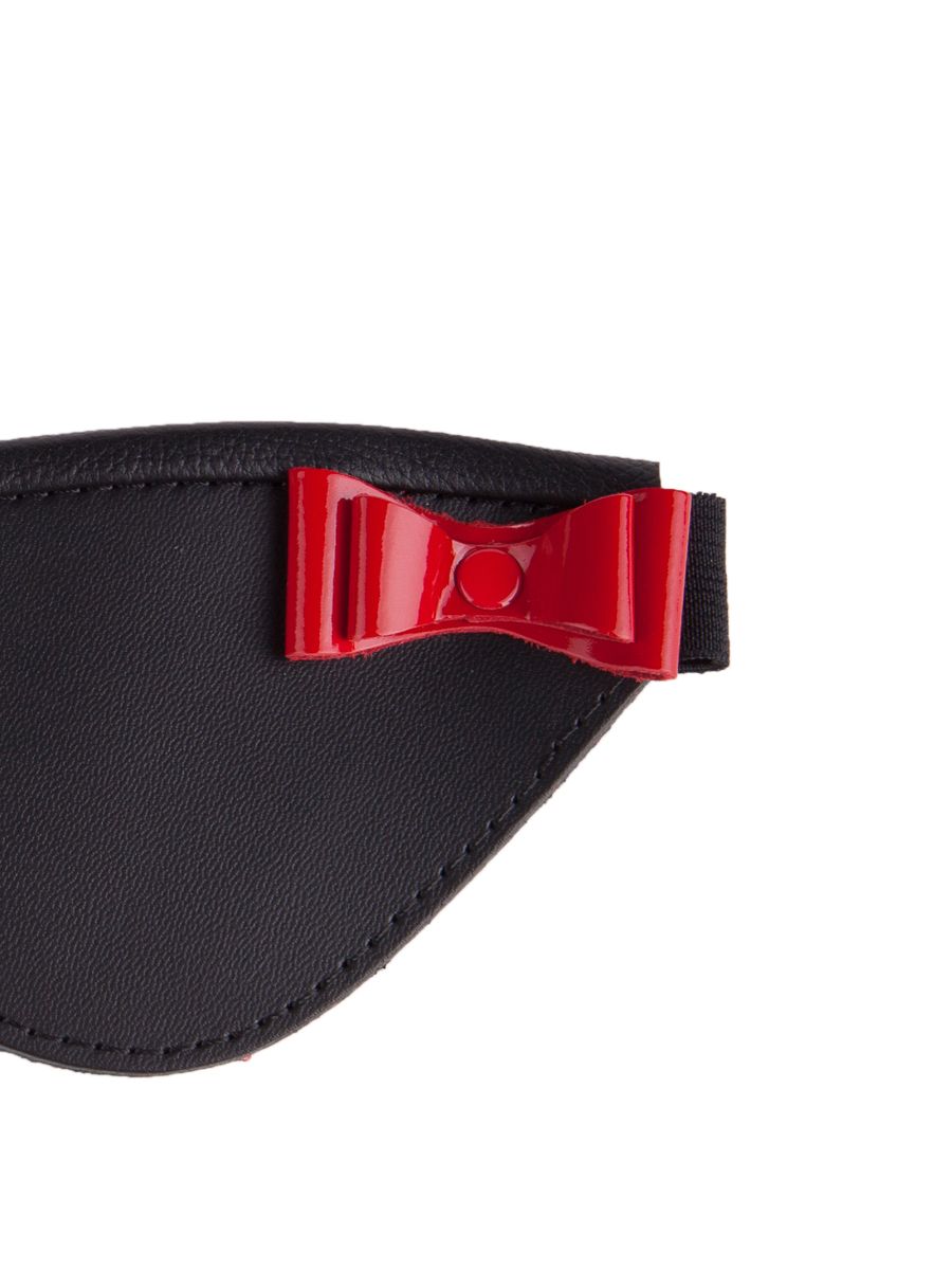 Маска на глаза закрытого типа из натуральной кожи черного цвета, украшенная красным лаковым бантом. Фиксирующая резинка позволяет легко регулировать размер изделия. Внутренняя часть имеет подкладку из велюровой бархатистой кожи. Ширина - 7 см.