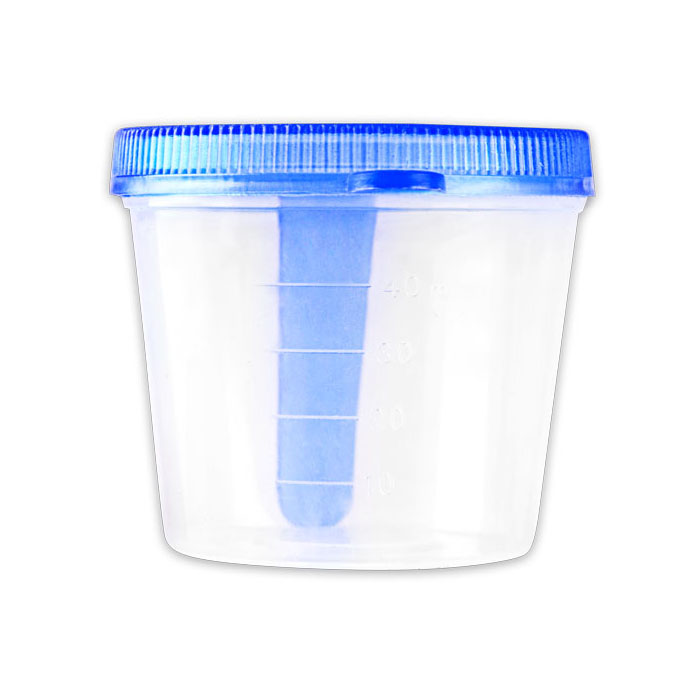 Прозрачный пластиковый контейнер для сбора анализов с синей крышкой. Баночку можно подписать.