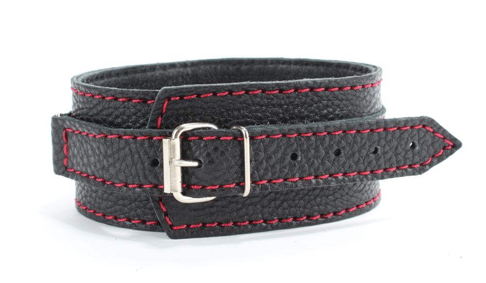 Черный кожаный ошейник с красной оторочкой. Декорирован небольшими заклепками в передней части изделия. Имеет D-кольцо для карабина. Имеет 7 отверстий для регулировки размера. Ширина - 5,4 см.