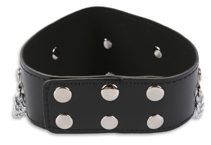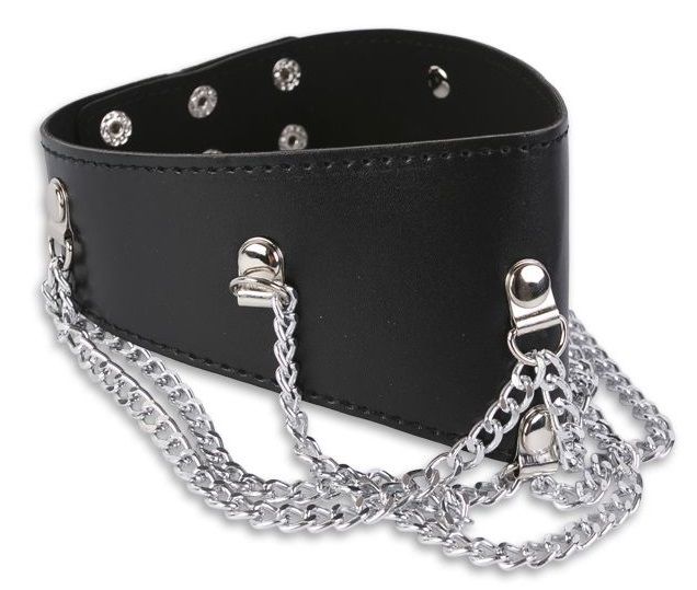 Великолепный атрибут для тех, кто хочет филигранно подчеркнуть свою ролевую принадлежность. Ошейник – универсальный элемент БДСМ игры! Наденьте его на своего Нижнего – пусть он выглядит так, как хочется вам! Широкий ошейник выполнен из кожзаменителя и по краям отделан качественными швами. Атрибут декорирован свободно свисающими цепочками и заклёпками. По размеру ошейник регулируется тремя рядами кнопок. Ширина - 3-6,5 см.