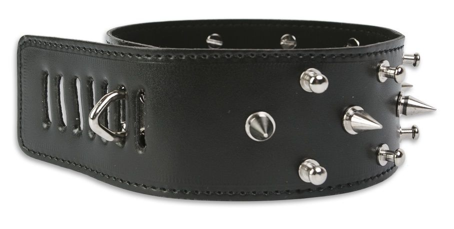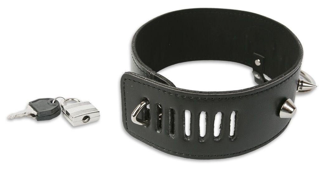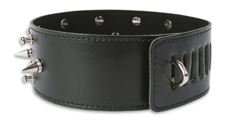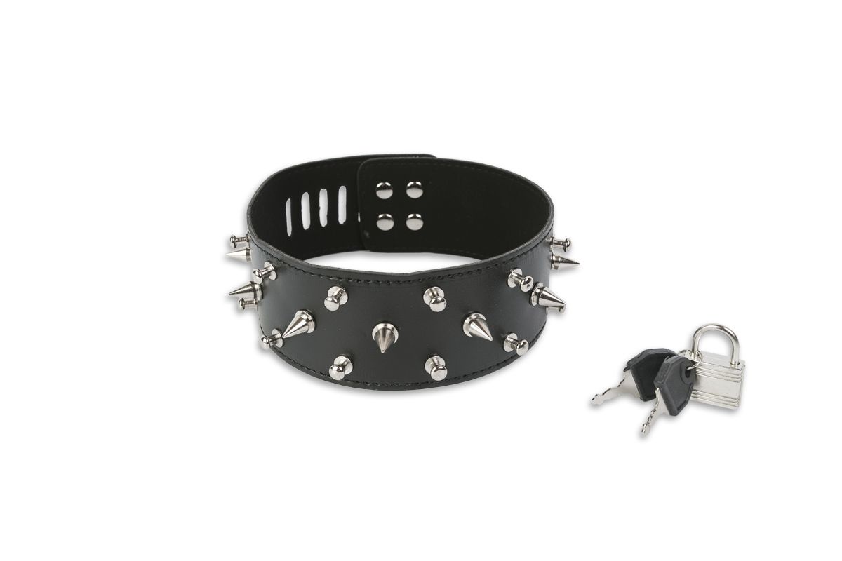 Аксессуар, который сделает ролевую игру полноценной. Наденьте ошейник на своего Раба и подчеркните его ролевую принадлежность! Качественный атрибут изготовлен из кожзама черного цвета. Достаточно широкий ошейник украшен множеством заклёпок и шипов. По размеру ошейник регулируется, а заданный размер фиксируется с помощью маленького замочка.