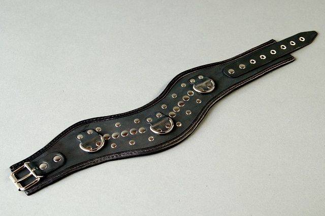 Широкий фигурный ошейник выполнен из натуральной кожи высокого качества и декорирован геометрическим рисунком из двух видов заклепок. Он оснащен тремя D-кольцами, которые обеспечивают удобство крепления различных бандажных систем(карабины,веревки,ленты). Мягкая подкладка и окантовка обеспечит максимальный комфорт и безопасность при использовании. Застегивается bdsm ошейник на ремешок с пряжкой. Минимальный обхват шеи - 37 см.,максимальный - 46 см.