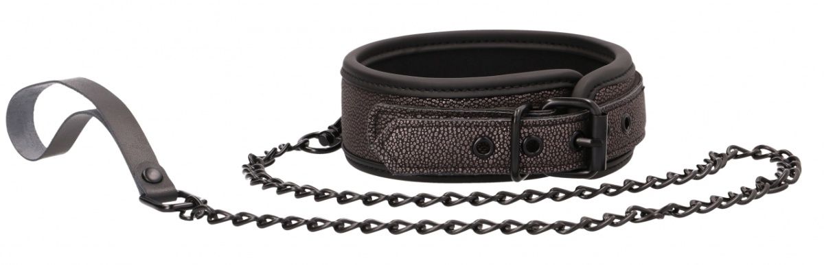 Elegant Collar with Leash – элегантный широкий ошейник, который служит атрибутом подчинения партнера во время эротических игр, а также в БДСМ практиках. Он имеет нежную окантовку и подкладку из неопрена, что обеспечивает приятное прикосновение и позволяет избежать раздражения даже на чувствительной коже. Ошейник оснащен D-кольцом, к которому можно подсоединить поводок в виде металлической цепочки с фиксацией в виде петли для руки, идущий в комплекте. Ремешок с классической пряжкой имеет 7 отверстий для удобного регулирования размера. Ширина ошейника - 5 см. Длина цепочки - 77 см.