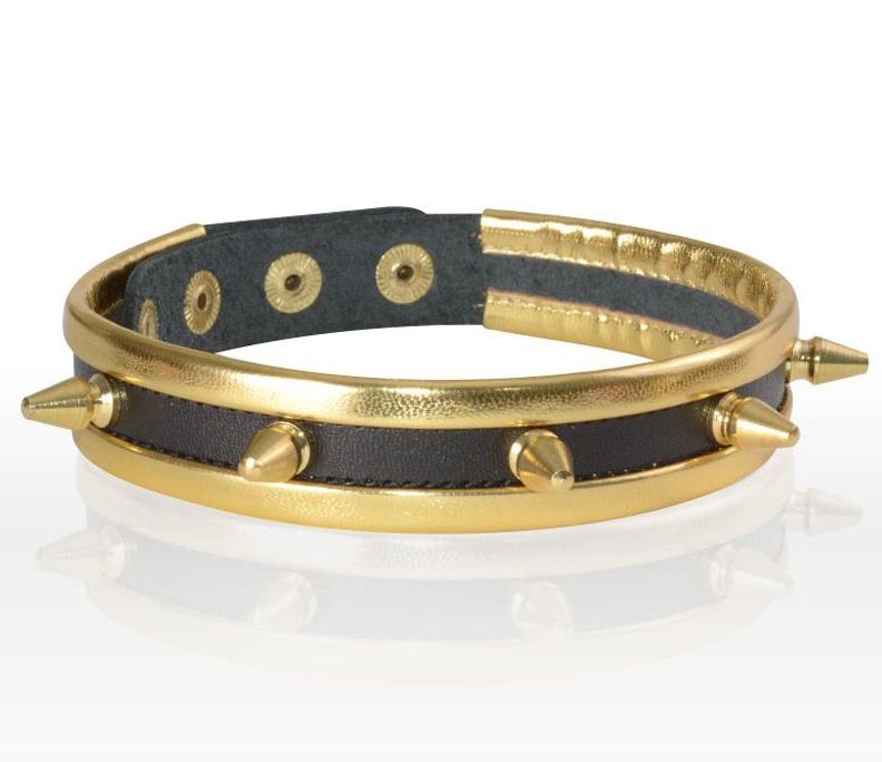 Узкий ошейник чокер из плотной натуральной высококачественной кожи черного цвета с золотой контрастной отделкой, украшенный пятью золотистыми металлическими шипами. По краю ошейника проходит оторочка, обеспечивающая комфорт при ношении. Оденьте ошейник на шею и зафиксируйте с помощью кнопок с никелированным покрытием. Ширина - 2 см.