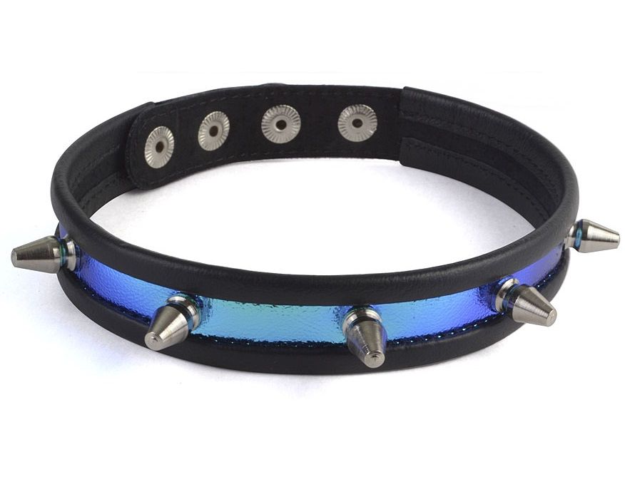 Узкий ошейник чокер из высококачественной натуральной кожи, украшенный вставкой из особого голографического материала цвета хамелеон и пятью серебристыми металлическими шипами. По краю ошейника проходит оторочка из черной кожи, обеспечивающая комфорт при ношении. Особенностью материала является то, что помимо синего, бирюзового и салатового, он способен принимать множество промежуточных оттенков. Ширина - 2 см.