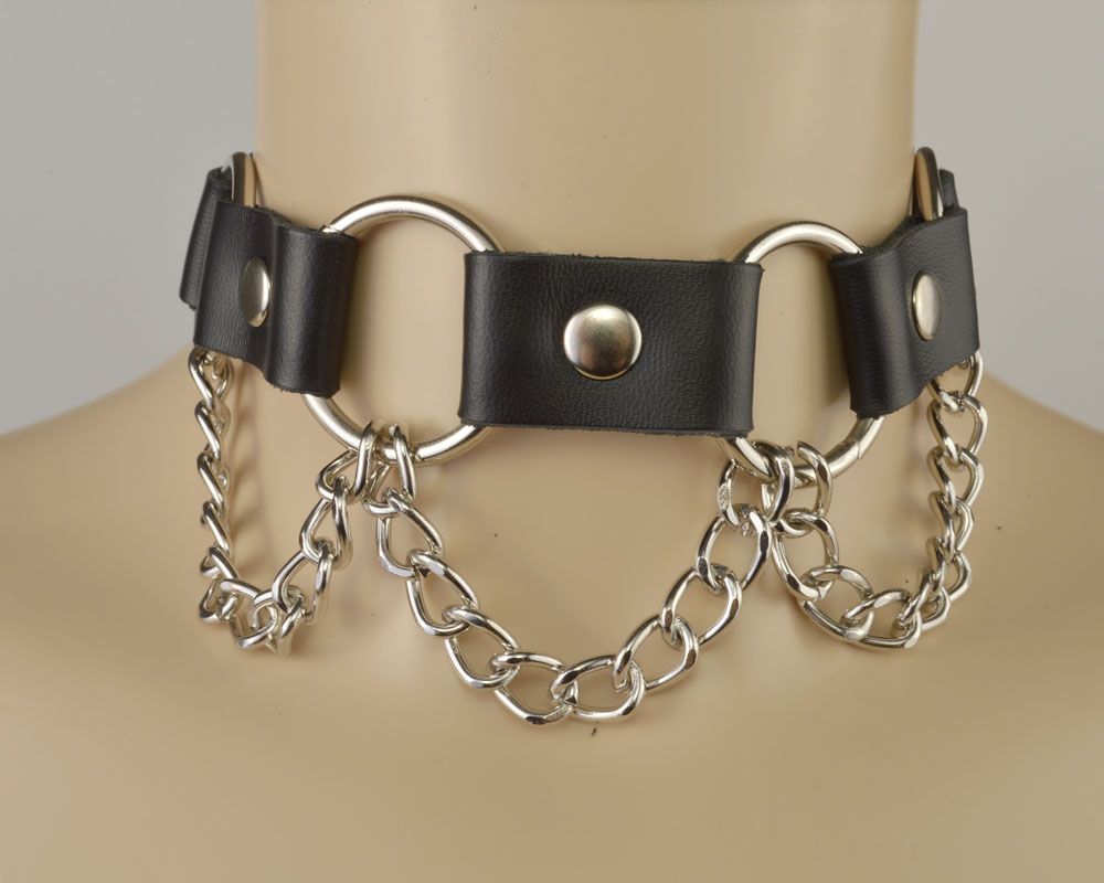 Чёрный кожаный ошейник с кольцами и цепочкой