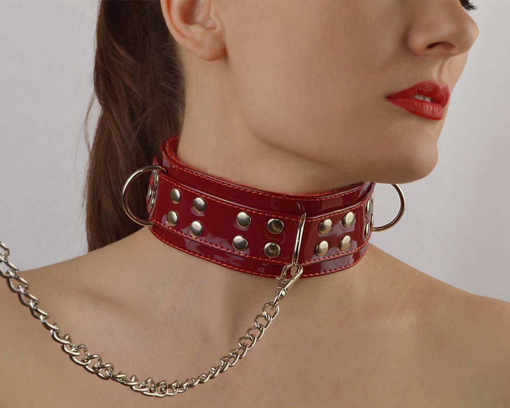 Ошейник предназначен для создания эротичного образа в ролевых играх, а также позволит управлять партнёром при помощи поводка. Ошейник изготовлен из лаковой искусственной лаковой кожи. В качестве подклада используется искусственный мех, мягкий и приятный на ощупь. Регулируется ошейник при помощи металлической пряжки. Фурнитура имеет никелевое покрытие. В комплекте с ошейником идет поводок в виде цепочки с карабином и петлёй из искусственной кожи, для запястья. Длина поводка-цепочки - 100 см.