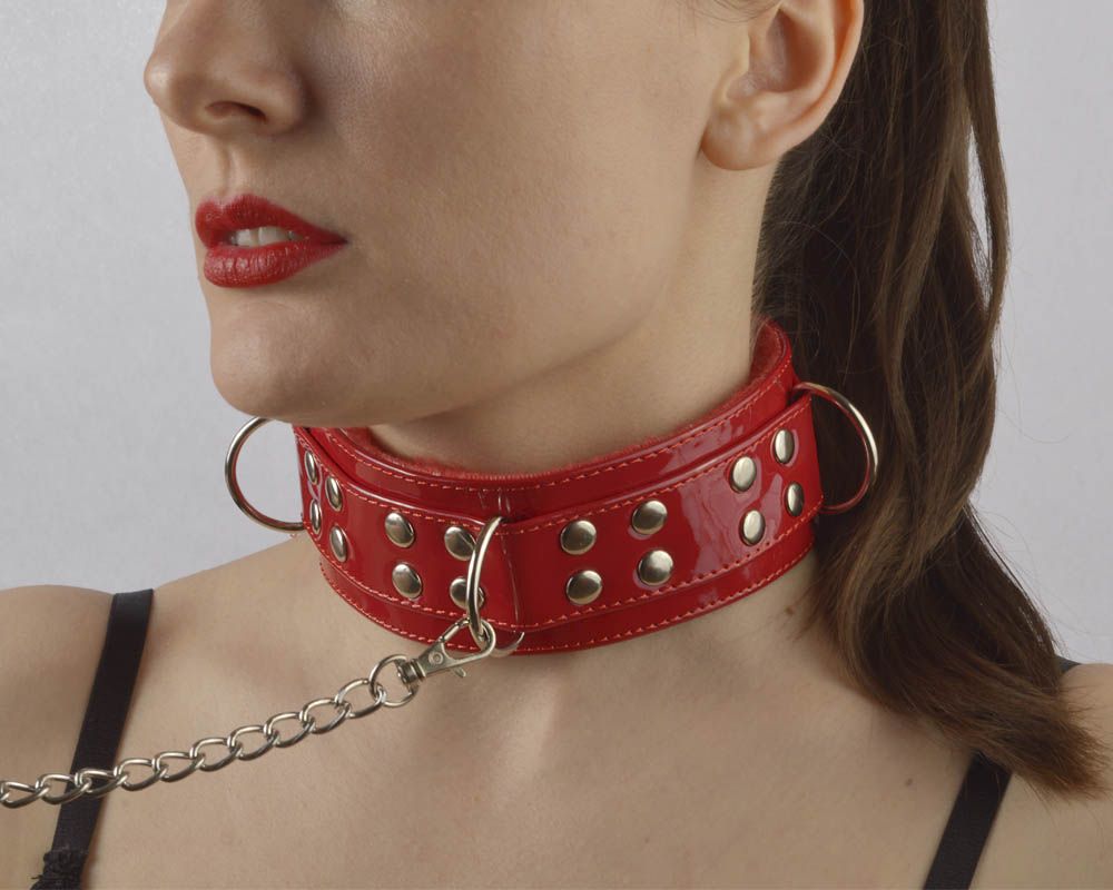 Ошейник предназначен для создания эротичного образа в ролевых играх, а также позволит управлять партнёром при помощи поводка. Ошейник изготовлен из лаковой искусственной кожи. В качестве подкладки используется искусственный мех, мягкий и приятный на ощупь. Регулируется ошейник при помощи кнопок. Фурнитура имеет никелевое покрытие. В комплекте с ошейником идет поводок в виде цепочки с карабином и петлёй из искусственной кожи, для запястья. Длина поводка-цепочки - 100 см.