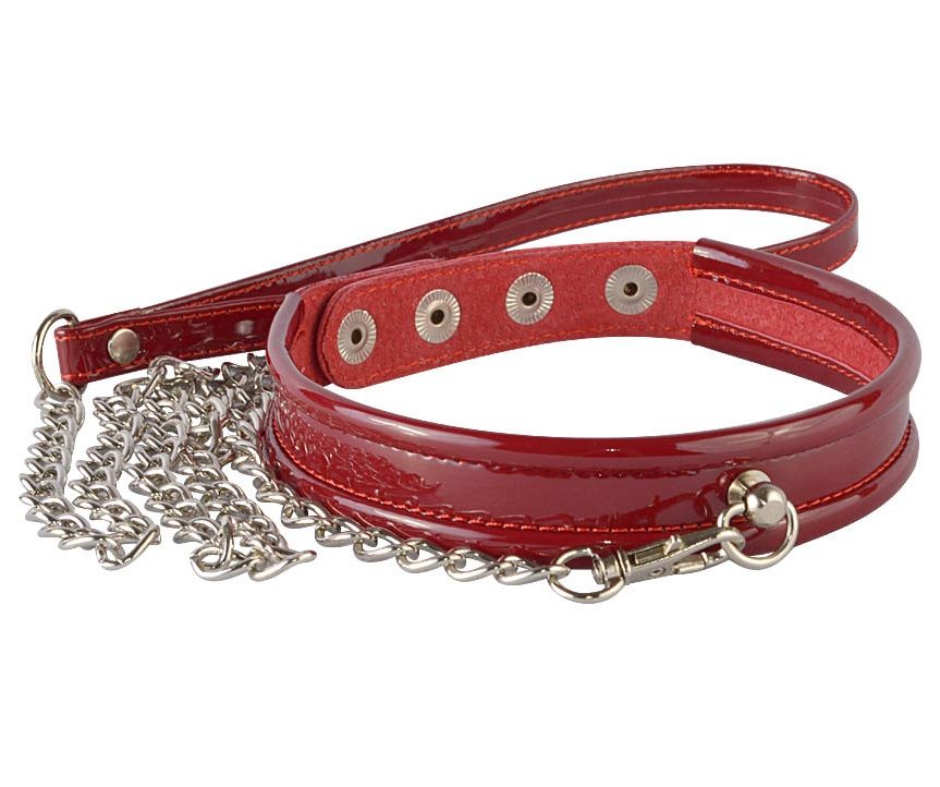 Ошейник изготовлен из лаковой искусственной кожи вишневого оттенка. Комфортное ношение обеспечивают округлые края изделия, обработанные оторочкой. Зафиксировать ошейник и отрегулировать размер можно при помощи кнопок. В паре с ошейником идет поводок-цепочка, общая длина которого около метра. Вся металлическая фурнитура имеет никелевое покрытие. Ширина - 2,2 см.