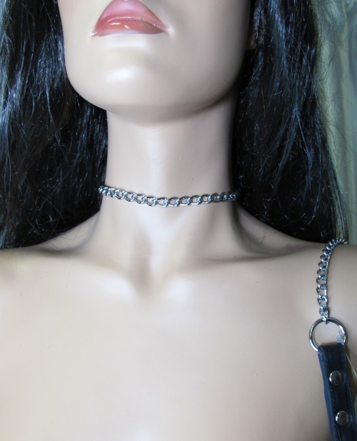 Поводок изготовлен из натуральной кожи. При изготовлении использована фурнитура с никелевым покрытием. Металлическая цепочка (поводок), с карабином на конце, поможет вам с лёгкостью управлять своим партнёром. Длина цепочки - 90 см., ширина - 0,8 см.
