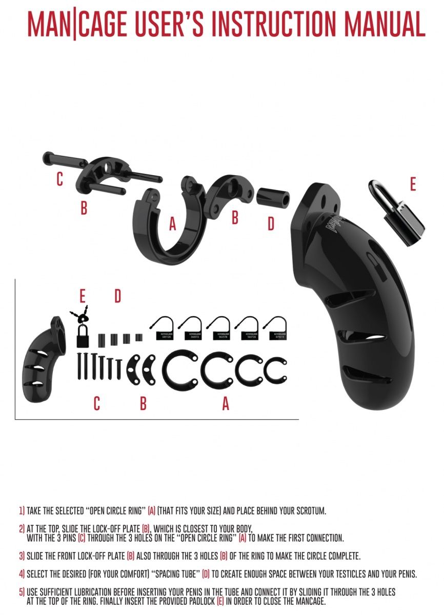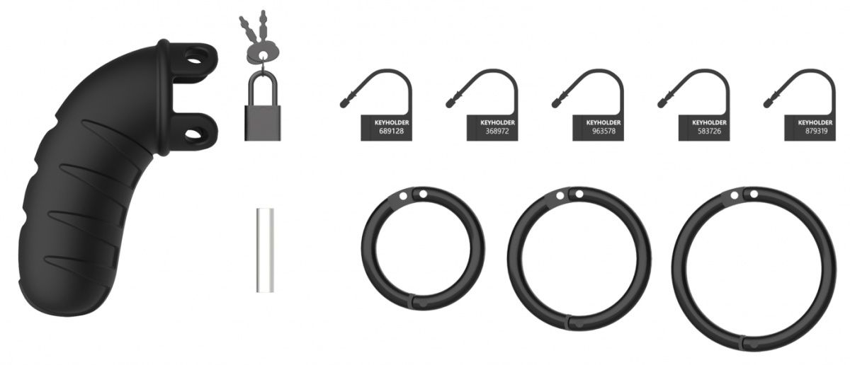 Cock Cage Model 09 Chastity – специализированное приспособление для мужчин, предназначенное для предотвращения эрекции, полового акта или мастурбации. В комплект входит железный замок и тонкая гибкая лента высокой прочности. Благодаря мягкому высококачественному силикону пояс идеально подходит для долговременного ношения. Изделие состоит из нескольких разборных частей: клетки, кольца и штифтов, которые идеально сочетаются друг с другом. В комплекте к поясу идет 3 кольца разных диаметров для разных размеров и предпочтений. Просто выберете подходящий размер кольца, соедините его тремя штифтами, оденьте на средний штифт специальную втулку и соедините с клеткой. На центральном штифте есть специальное отверстие для замка. Выберете один из замков и зафиксируйте пояс. Фиксация тонкой гибкой лентой высокой прочности гарантирует, что металлоискатели на пояс не среагируют.Для поддержания надлежащей гигиены устройство снабжено вентиляционными отверстиями и отверстием для мочеиспускания.