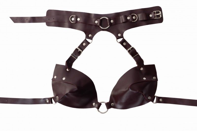 Роскошная сбруя выполнена из натуральной кожи. Высокий ошейник с металлическим кольцом спереди присоединяется к изысканному кожаному лифу. Сбруя фиксируется ремнями и пряжками, позволяющими подобрать нужный размер. Размер универсальный. Страстный аксессуар станет отличным дополнением к БДСМ-игре. Ширина ошейника - 5,5 см. Ширина ремешков - 2 см. Обхват - 31-42 см.