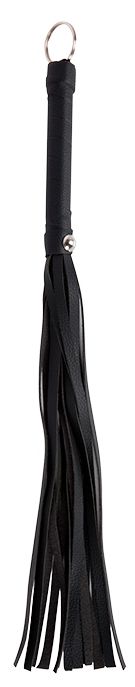 Черный флоггер с узкими лентами. Металлическое уплотнительное кольцо прикреплено к рукоятке для удобства использования. Длина ручки - 11 см.