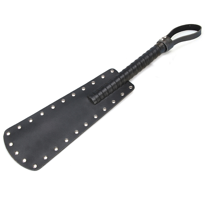 Шлепалка черного цвета со внушительным размером рукояти и ударной поверхности, которая по периметру отделана металлическими клепками. Большая, но удобная рукоять покрыта качественной искусственной кожей. Длина ударной поверхности - 33 см. Максимальная ширина - 12 см. Длина рукояти - 16 см.