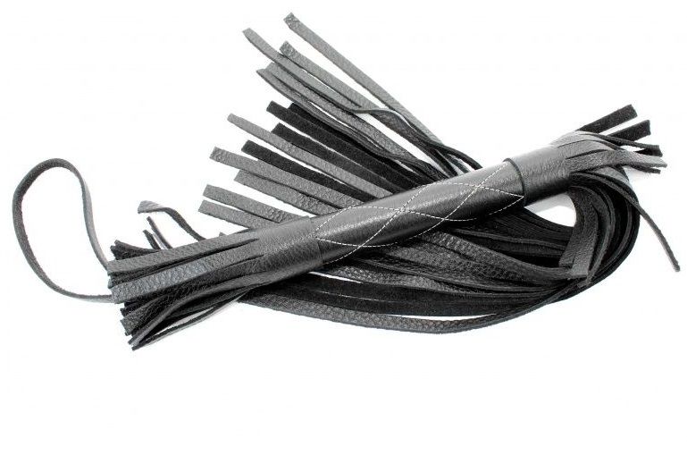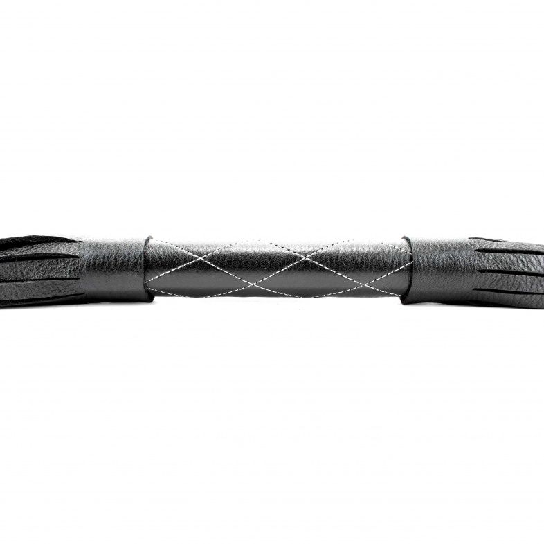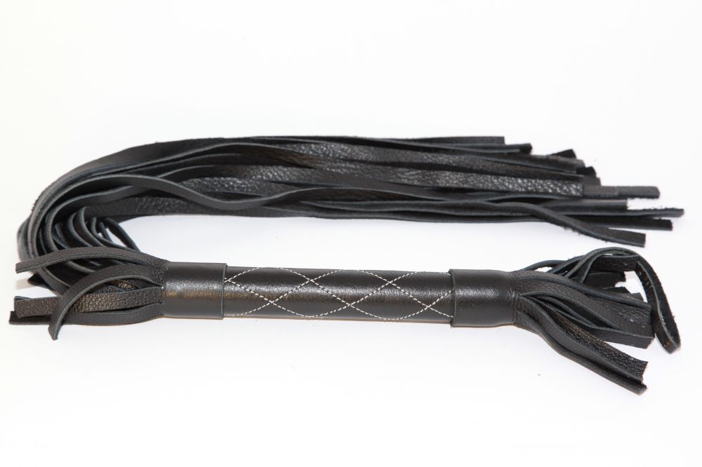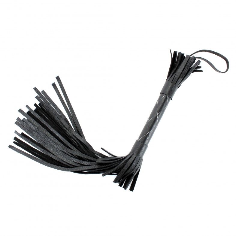 Аккуратная черная плетка, изготовленная из натуральной кожи. Имеет жесткую ручку, также покрытую кожей и украшенную белыми простроченными нитями. Имеется петля для удобного использования плети. Длина рукояти - 17 см. Длина хлыстов - 27 см.
