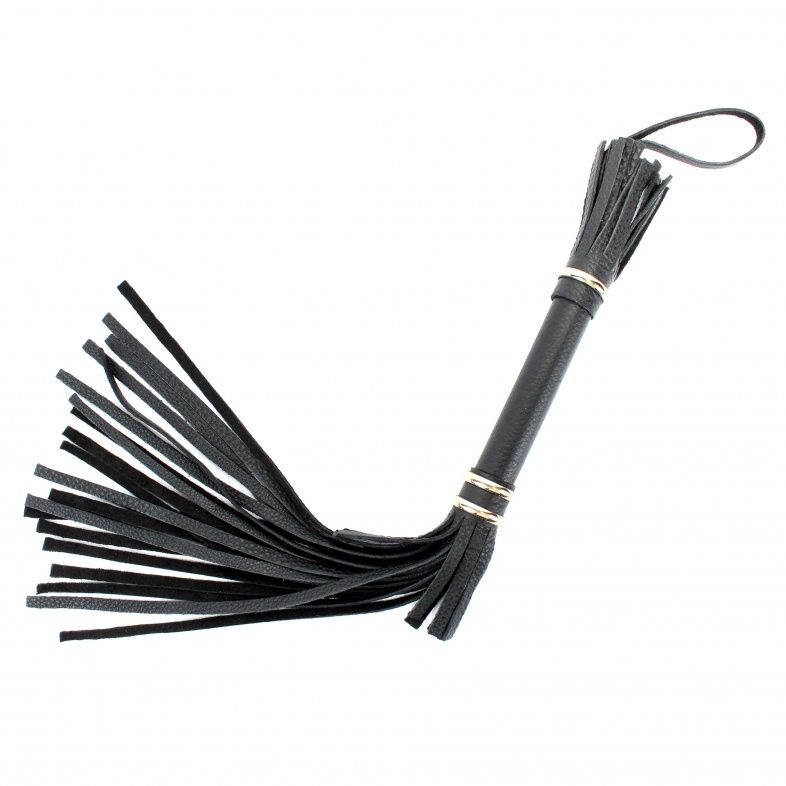 Аккуратная черная плетка, изготовленная из натуральной кожи. Имеет жесткую ручку, также покрытую кожей и украшенную золотыми кольцами. Имеется петля для удобного использования плети. Длина ручки - 17 см. Длина хлыстов - 27 см.