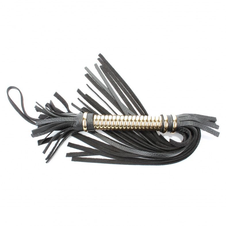 Чёрная кожаная плетка с золотистой рукоятью.