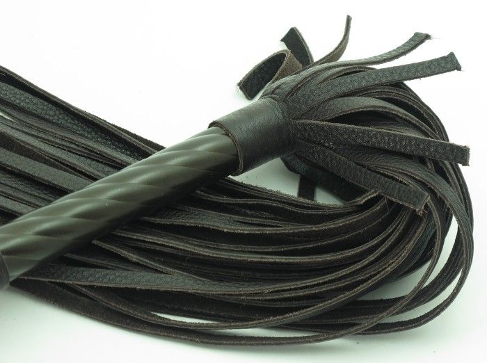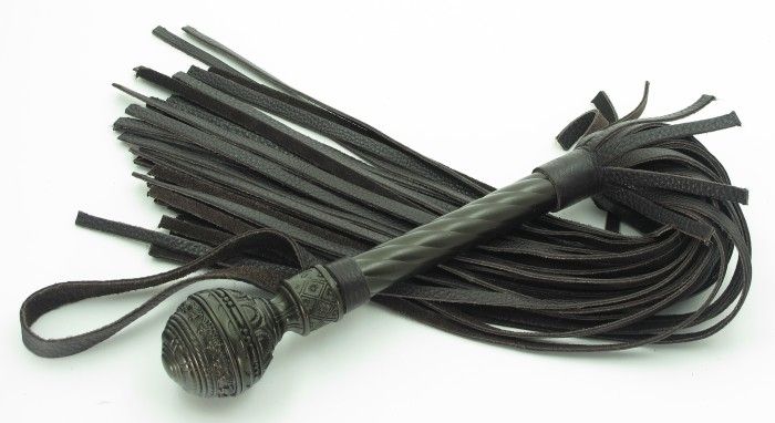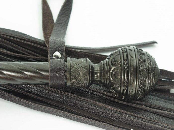 Величественная плеть из натуральной кожи, с жесткой рукояткой, украшенной эксклюзивным кованым скипетром. Имеет удобную петлю для комфортного использования. Длина рукоятки - 22,5 см., длина хлыстов - 40 см.