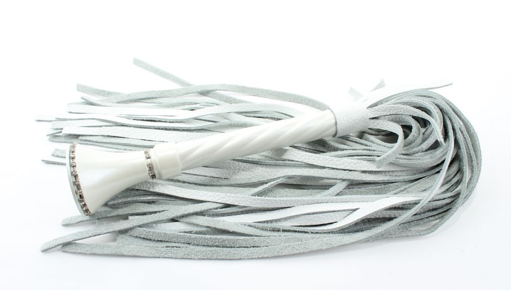 Роскошная плеть из белой кожи, имеет 40 длинных хвостов. Металлическая витая ручка украшена сверкающими кристаллами. Длина хвостов - 39 см.