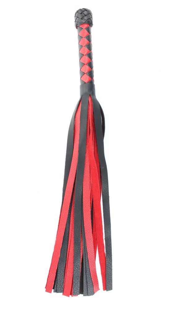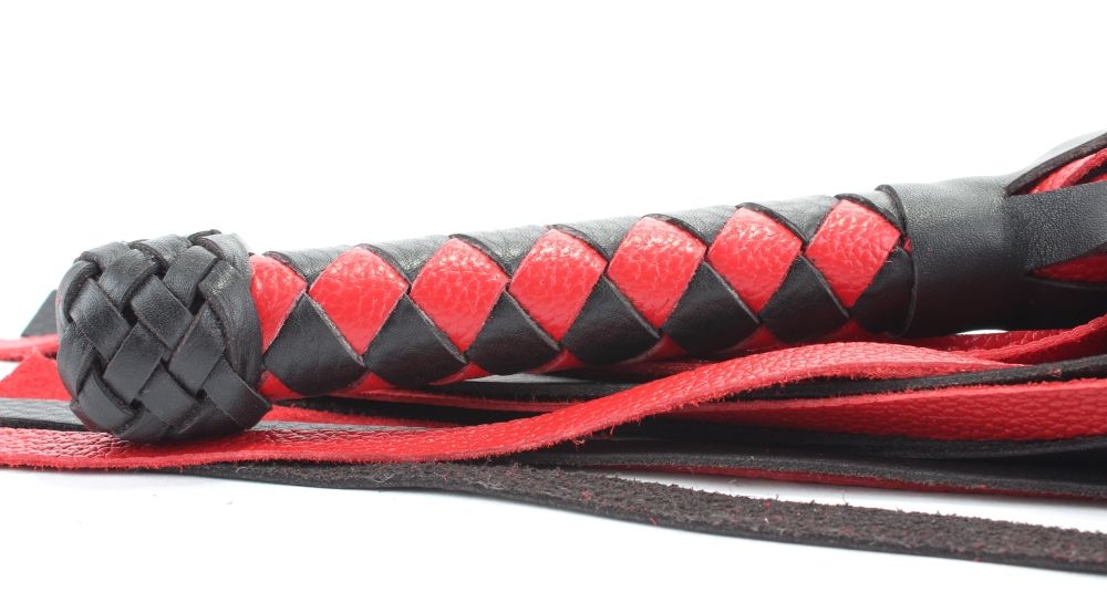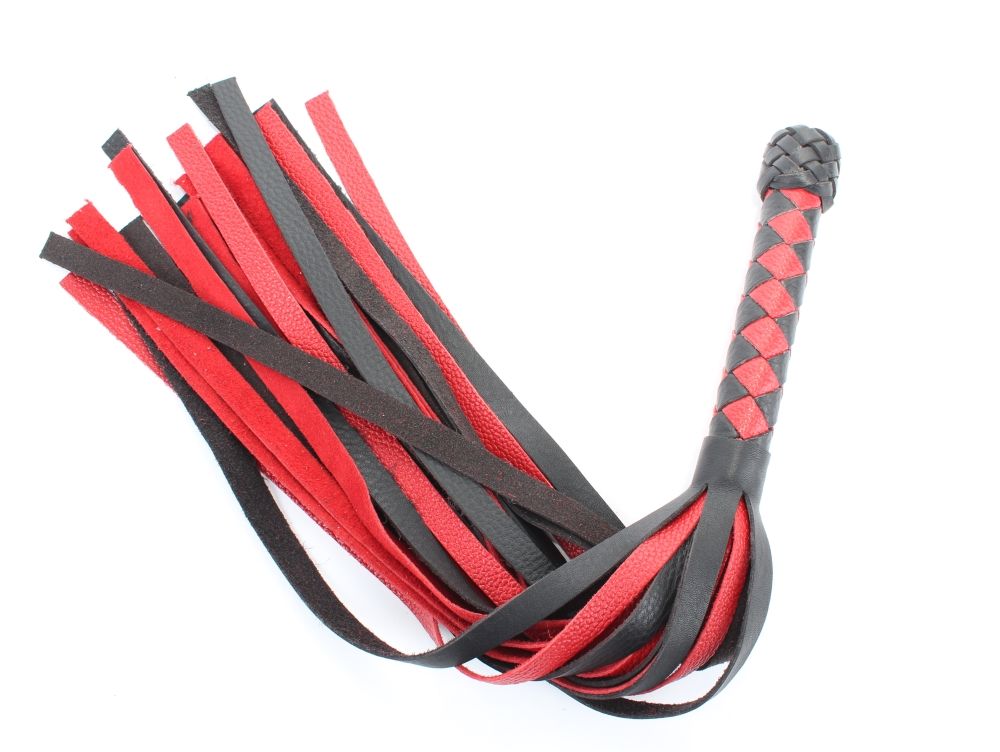 Плеть изготовлена из натуральной кожи, имеет красные и черные хвосты. Хвосты имеют вид лент шириной. Имеется жесткая ручка, выполненная в красно-черный ромб. Длина хвостов - 42 см.