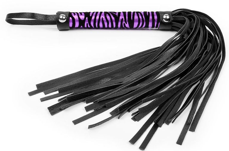 Чёрная многохвостовая плеть с круглой фиолетовой ручкой-зеброй