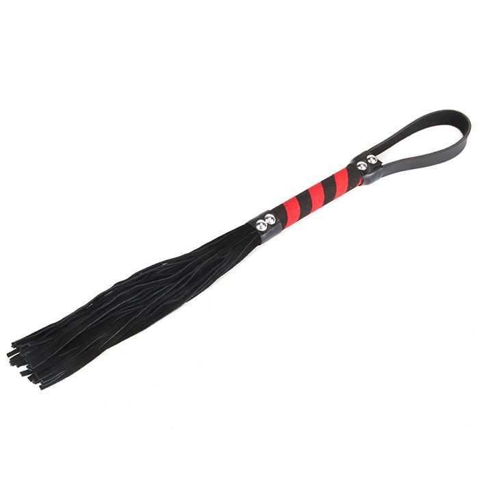 Качественная плеть с ворсистыми черными шнурками и очень удобной рукоятью. Плотная рукоять покрыта приятным материалом благодаря чему отлично сидит в руке и не выскальзывает. Оба конца рукояти отделаны искусственной кожей и металлическими клепками, а на ее основании имеется петля. Длина шнурков - 23 см. Длина рукояти без петли - 16,5 см.