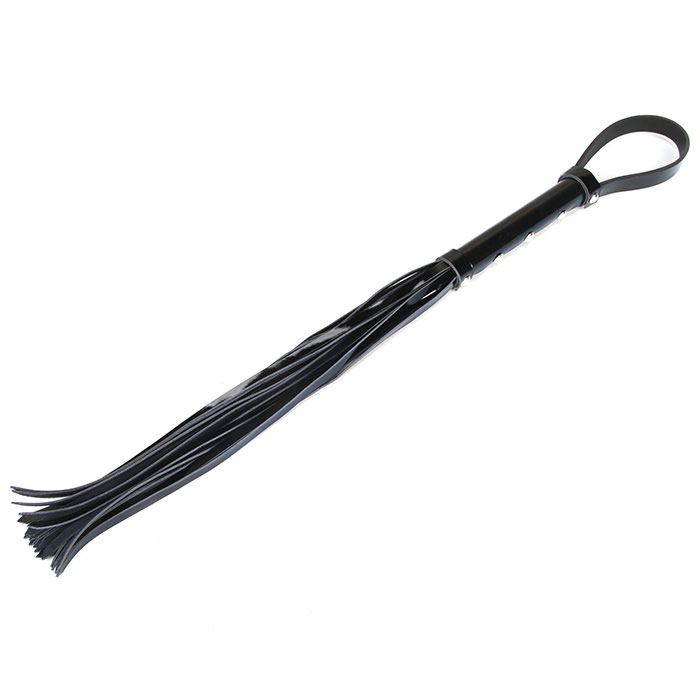 Стильная плеть, полностью покрытая черным глянцем, с оригинально заостренными концами шнуров. Металлические клепки на рукояти эффектно контрастируют с общим цветом плети, придавая дополнительный стилистический окрас. От рукояти отходит удобная петля. Длина шнуров - 40 см, длина рукояти без петли - 17 см.