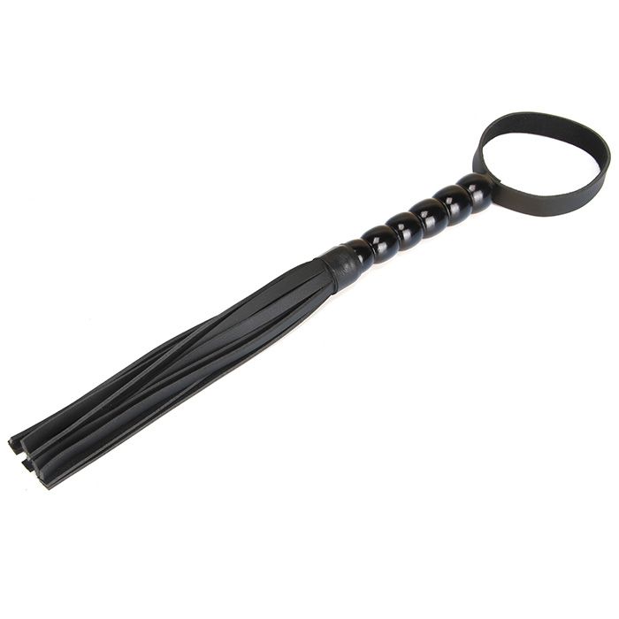 Черная плеть настоящего хозяина с оригинальной рукоятью. Шнуры выполнены из качественной искусственной кожи и с обратной стороны покрытые мягким ворсом. Благодаря необычной форме рукояти, плеть очень удобно и приятно сидит в руке. От основания рукояти отходит петля. Длина шнуров - 23 см. Длина рукояти без петли - 15 см.