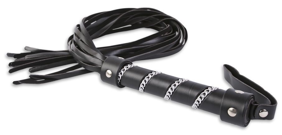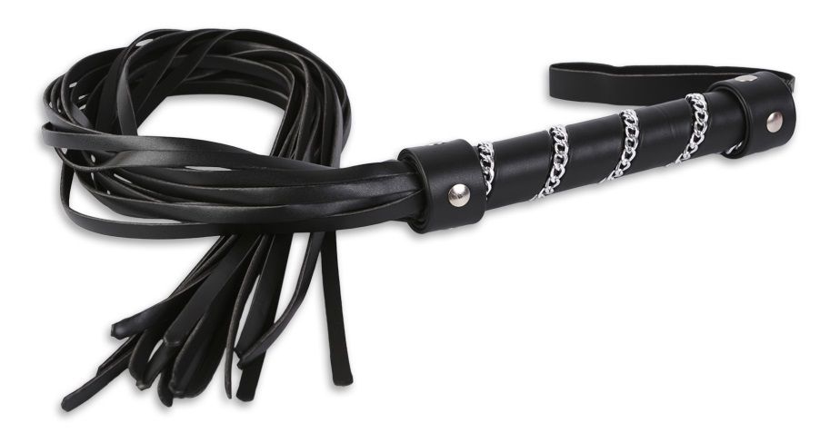 Эффектный девайс для ударов поя мягким местам Раба. Создайте незабываемый образ Доминанта, подчеркнув его неотъемлемым в БДСМ атрибутом. Плеть с множеством мягких хвостов наносит удары не на одно место, оказывая воздействие на большую площадь тела. Для удобства плётка снабжена длинной рукояткой и петелькой для руки. Рукоятка украшена цепочкой, которая обвивает её по спирали. Длина рукояти - 18 см.
