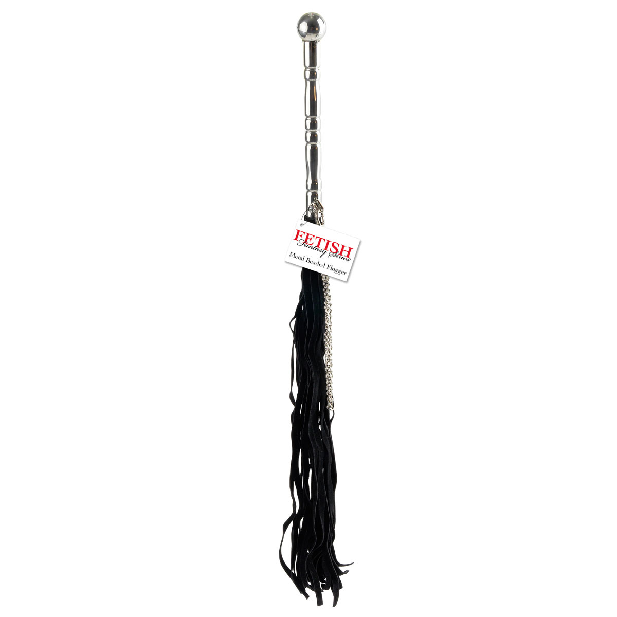 Флоггер Beaded состоит из металлической ручки (нержавеющая сталь) и хвостиков из бархатистого материла. К ручке крепится цепочка на карабине. Шикарная и то же время простая и удобная вещь. Длина рукояти - 22 см.