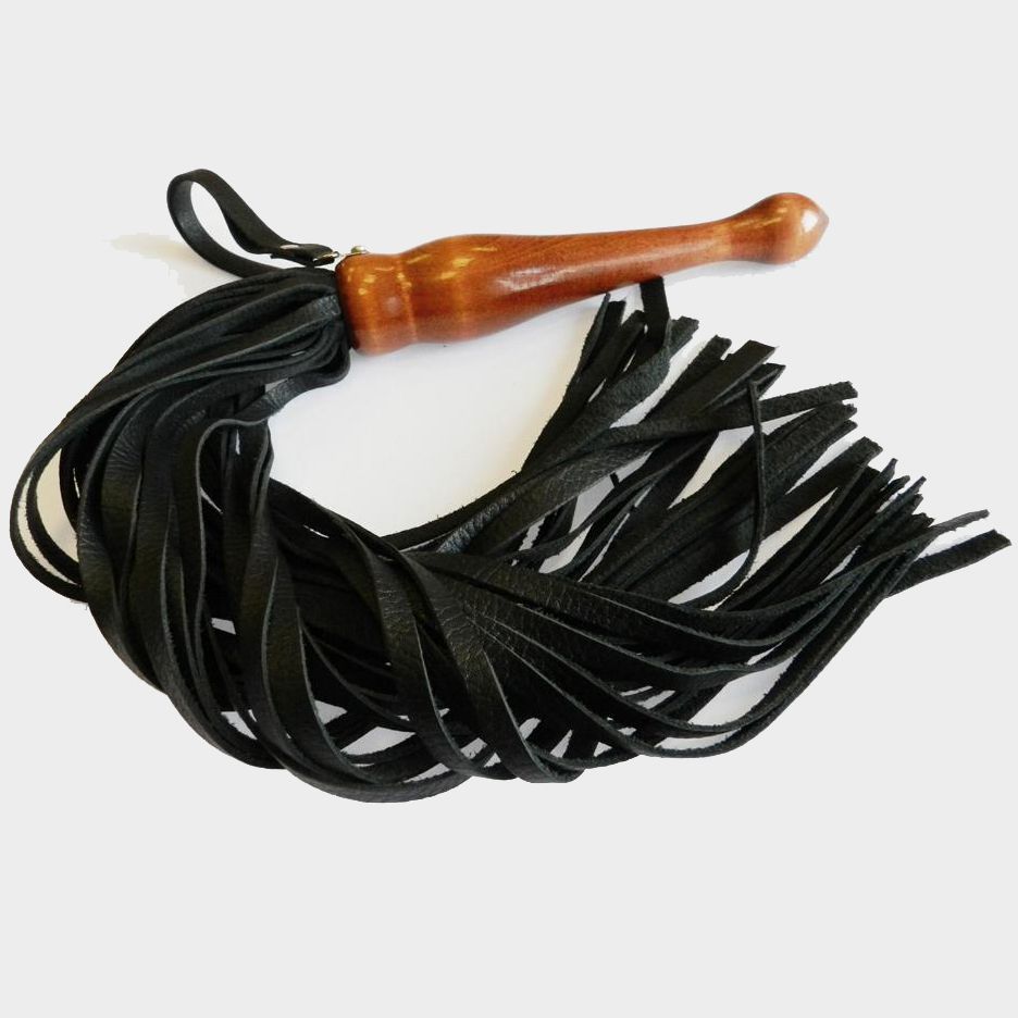Флогер с ручкой в форме анального стимулятора и мягкими кожаными хвостами. Плеть выполнена вручную. Ручка из натурального дерева, идеально отшлифована и покрыта несколькими слоями прозрачного лака. Длина полос - 40 см.